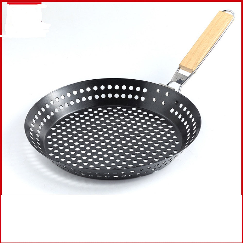 BBQ Folding Grill Pan with Holes 12" Nonstick Grill Skillet with Wooden Foldable Handle, Camping Cookware-Kabob-Grill Pan for Outdoor Barbecue